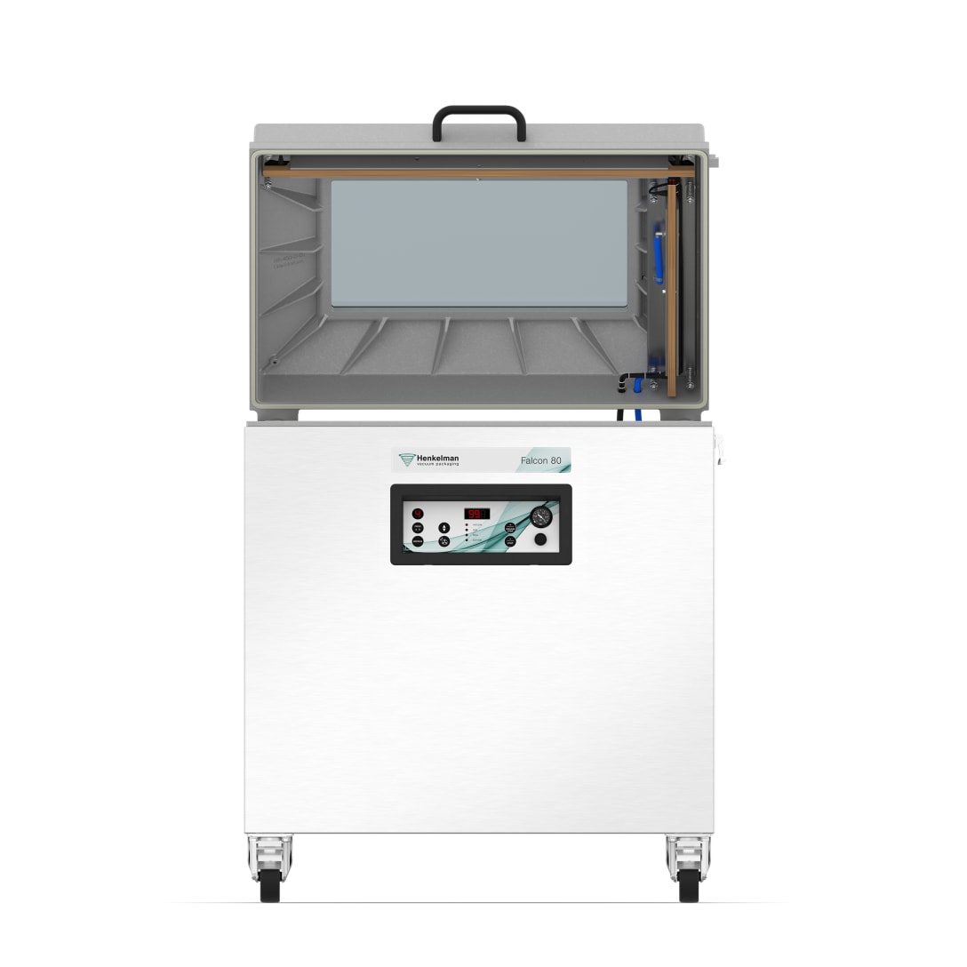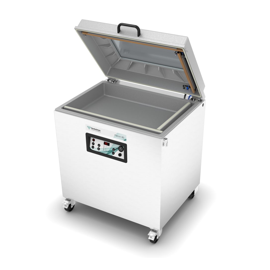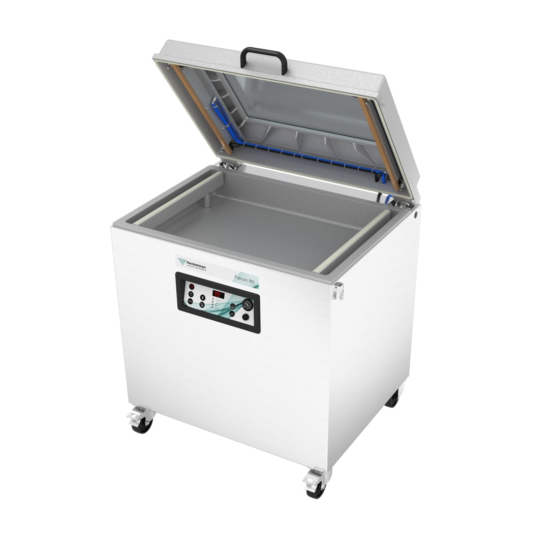 Henkelman Falcon Double Chamber (DC) to przemysłowa, wolnostojąca pakowarka próżniowa dwukomorowa, zaprojektowana do intensywnej pracy w zakładach przetwórczych i dużych kuchniach produkcyjnych. Aluminiowa konstrukcja łączy niską wagę z wysoką trwałością, a dwie głębokie komory umożliwiają pakowanie produktów o dużych gabarytach lub wielu mniejszych opakowań jednocześnie. To rozwiązanie dedykowane firmom pracującym na dużych wolumenach – w branży mięsnej, rybnej, warzywnej czy w produkcji żywności mrożonej.