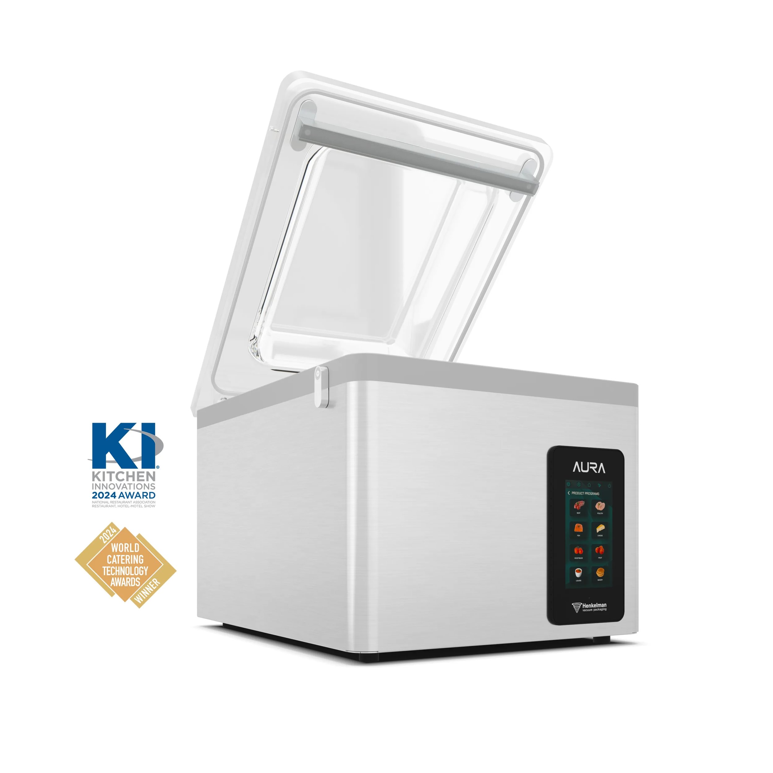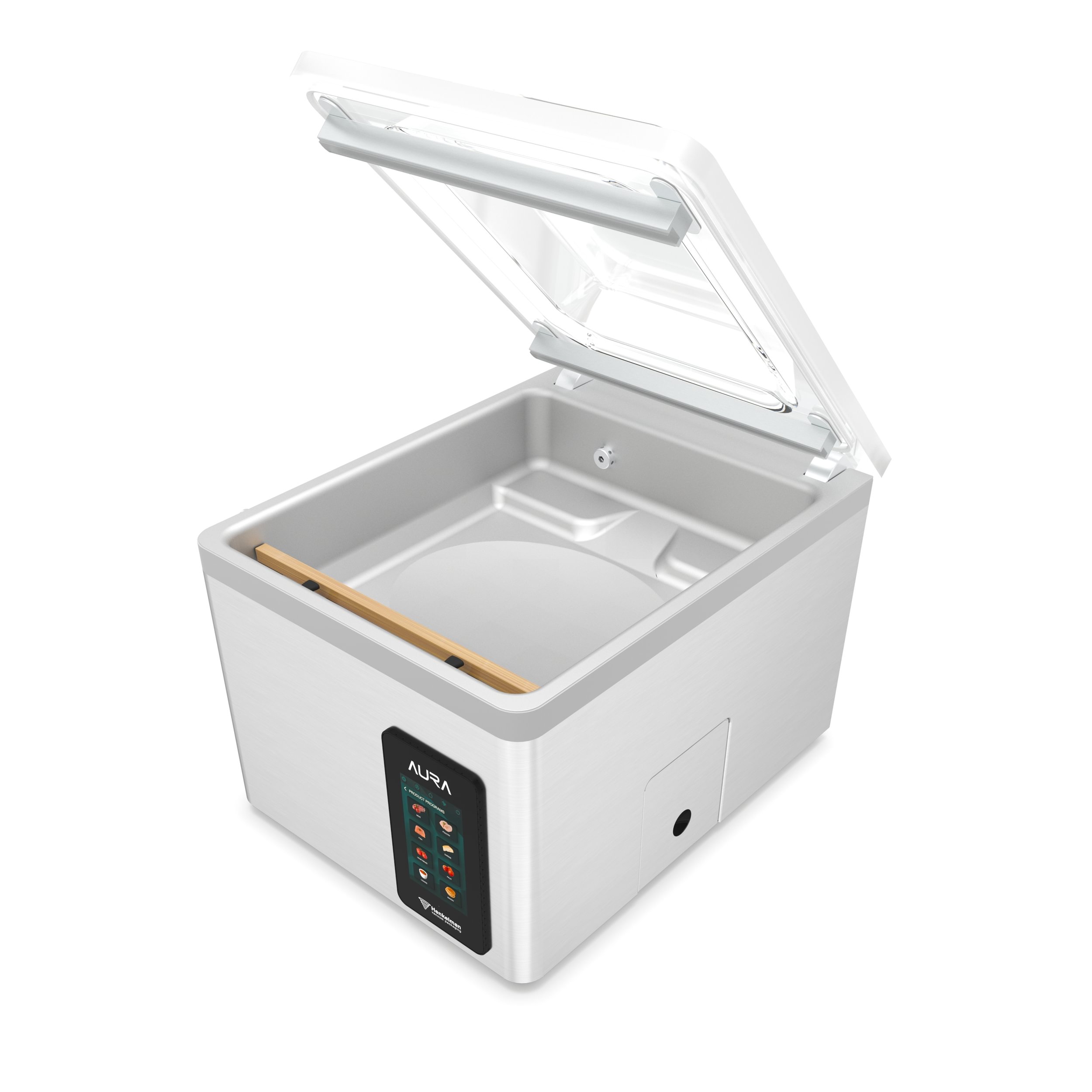 Model Aura wyposażono w nowoczesny, kolorowy panel dotykowy Henkelman H-touch, który umożliwia szybkie i intuicyjne sterowanie urządzeniem. Czytelne ikony i przejrzysty interfejs pozwalają uruchomić odpowiedni program jednym kliknięciem, znacząco przyspieszając pracę personelu. Całość została zaprojektowana w eleganckim, holenderskim stylu – z zaokrąglonymi narożnikami i zintegrowanym panelem sterowania, dzięki czemu urządzenie doskonale prezentuje się w otwartych kuchniach oraz przestrzeniach handlowych. Płynne przejścia między komorą a obudową ułatwiają utrzymanie higieny, a kompaktowa konstrukcja umożliwia rozbudowę o system płukania gazem lub drukarkę etykiet.