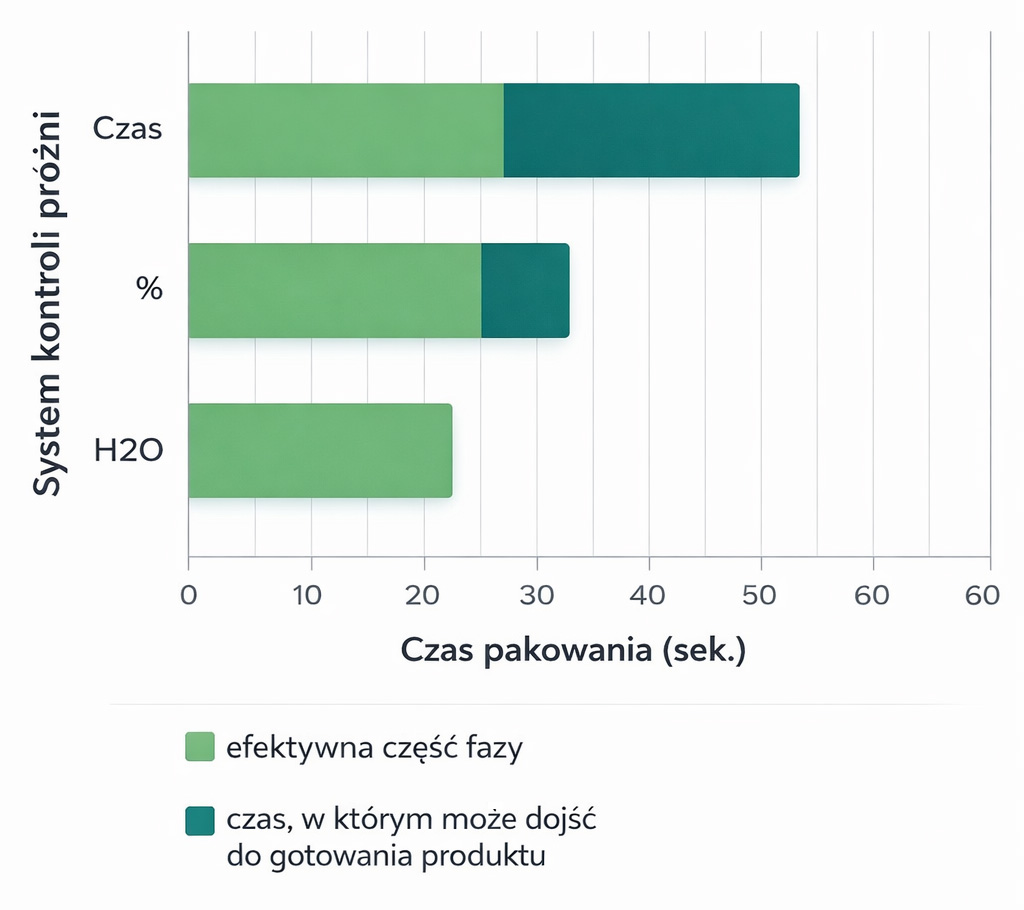 Zastosowanie czujnika punktu parowania H₂O lub czujnika poziomu próżni (%) pozwala automatycznie kontrolować ten moment. System wykrywa odpowiedni poziom próżni lub pojawienie się wilgoci i sam skraca cykl pracy, zapobiegając negatywnym skutkom gotowania produktu. Dzięki temu proces pakowania jest bardziej bezpieczny, powtarzalny i efektywny.